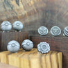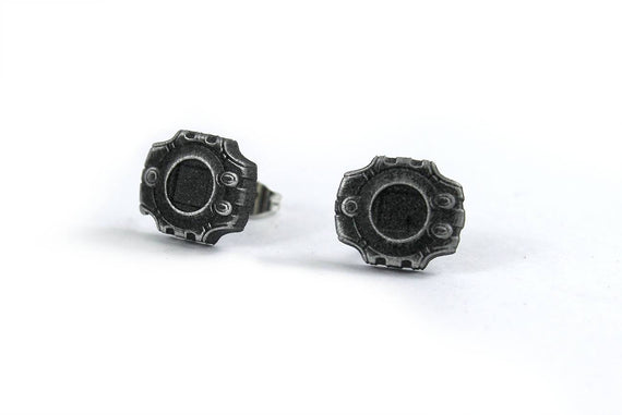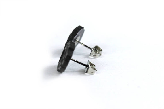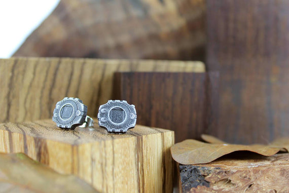 Each of our earrings is hand crafted with quality and care as our main priority. They start out as hand sculpted models that are then molded and cast with a special crystal resin and metal powder mix. This cast is then cleaned and aged using a method that brings out the design out to a shiny finish and leaves the piece with an antiqued feel. Each one is cleaned and secured to hypoallergenic stainless steel studs using super strong adhesive, leaving the finish piece lightweight and durable!